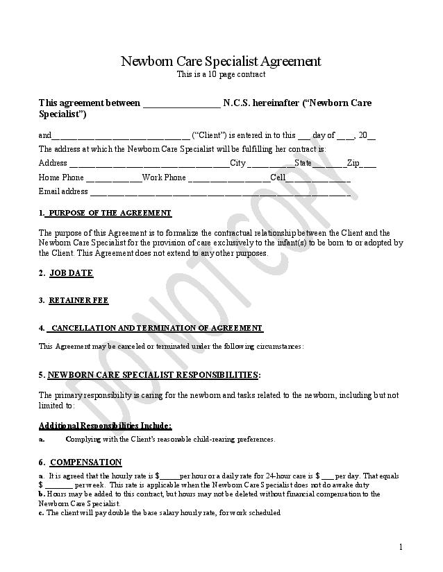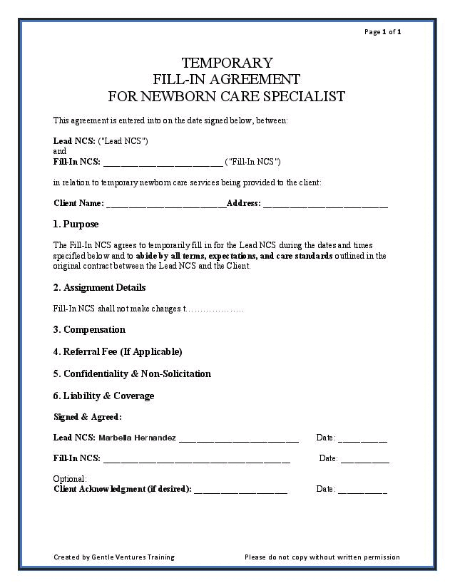 Temporary Fill-In Agreement For Newborn Care Specialist